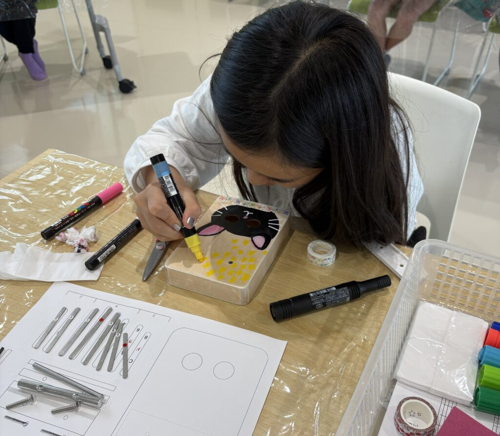 カラーペンやシールで自由にデコレーションし、組み立てて、